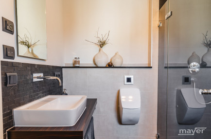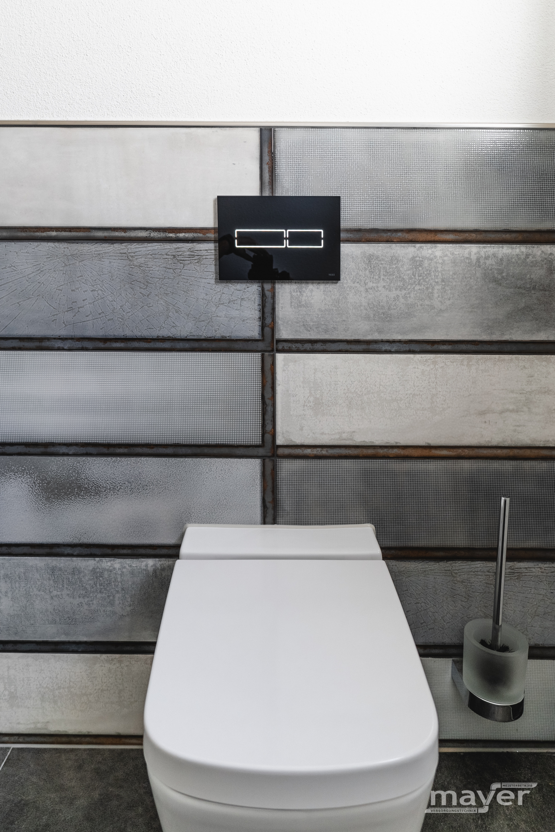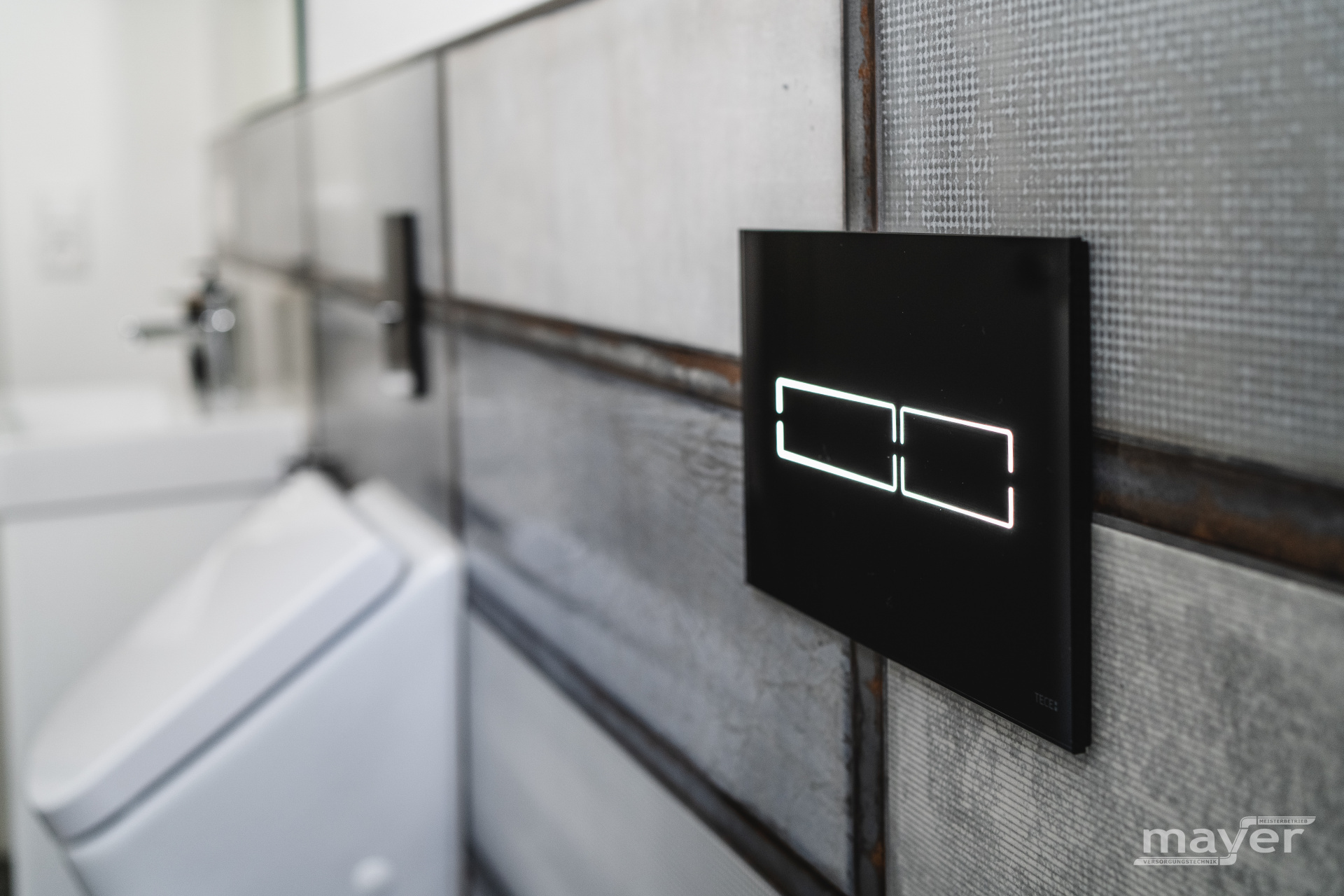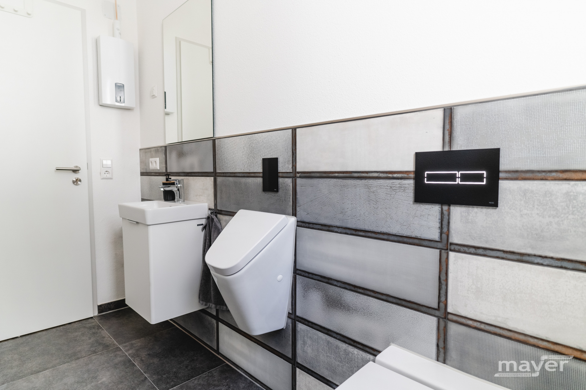 WC Einheit in einem Gewerbeobjekt mit Dusch - WC und Urinal. Die Spülung erfolgt hygienisch ohne Berührung der Bedienplatte durch ein reaktives Sensorfeld.